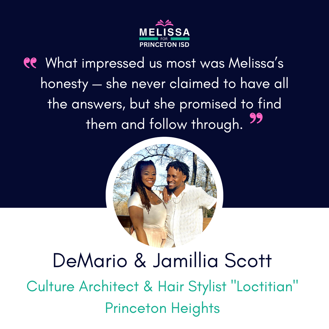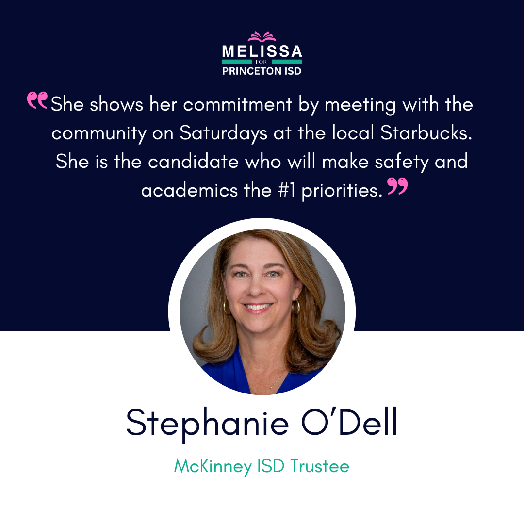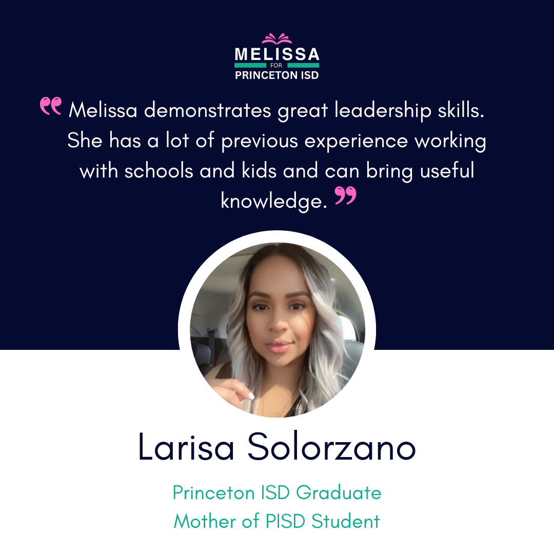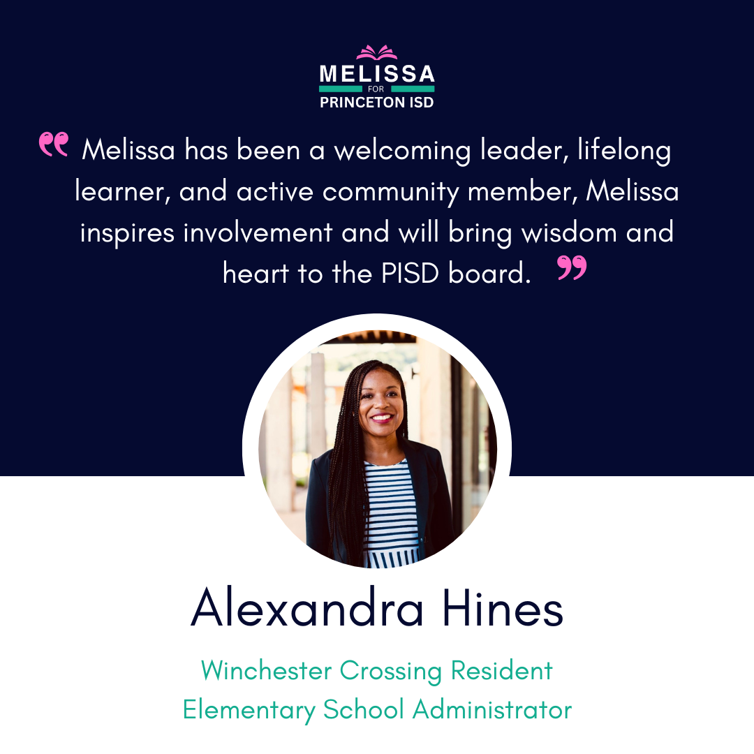“Melissa would be a tremendous addition to the PISD school board because of her many years of experience in education. She not only understands the challenges and opportunities schools face, but also models what it means to be a lifelong learner. Melissa’s commitment to personal growth and her ability to inspire others sets her apart as a true leader. Since moving to Princeton, she has made me feel welcome and included, showing firsthand how much she values community and connection. She is actively involved in local initiatives and never hesitates to step in where she can make a difference. Melissa is a change maker whose energy and vision encourage others, including myself, to get involved and give back. She will bring both wisdom and passion to PISD, always putting students and families first.”